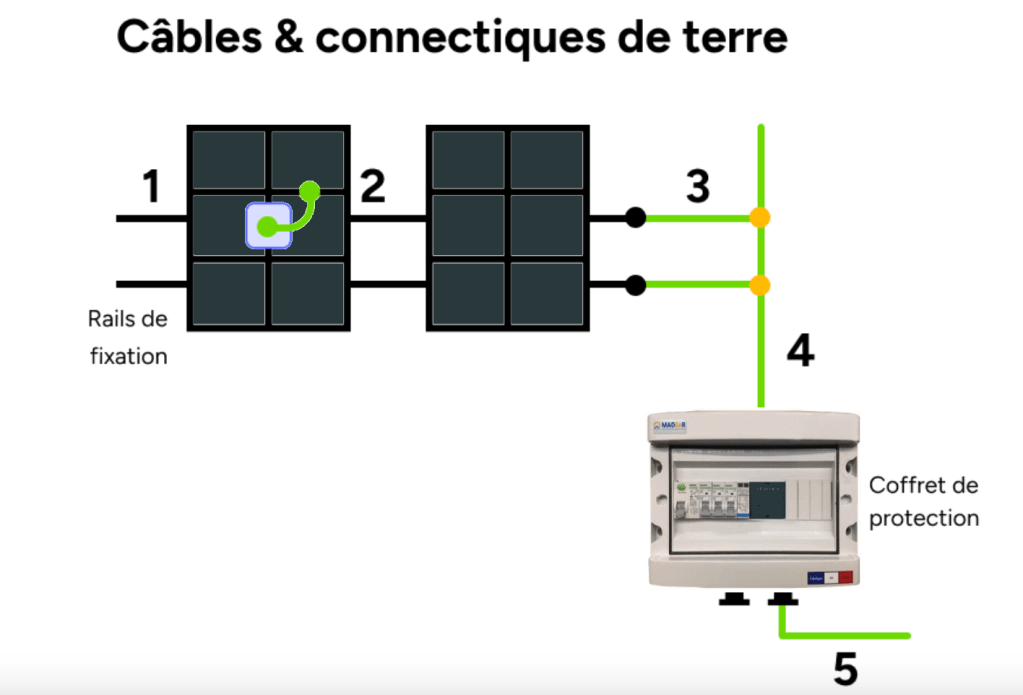 - Utilisez des terragrifs pour lier électriquement les cadres des panneaux à la structure de fixation, elle-même reliée à la terre via le coffret de protection.